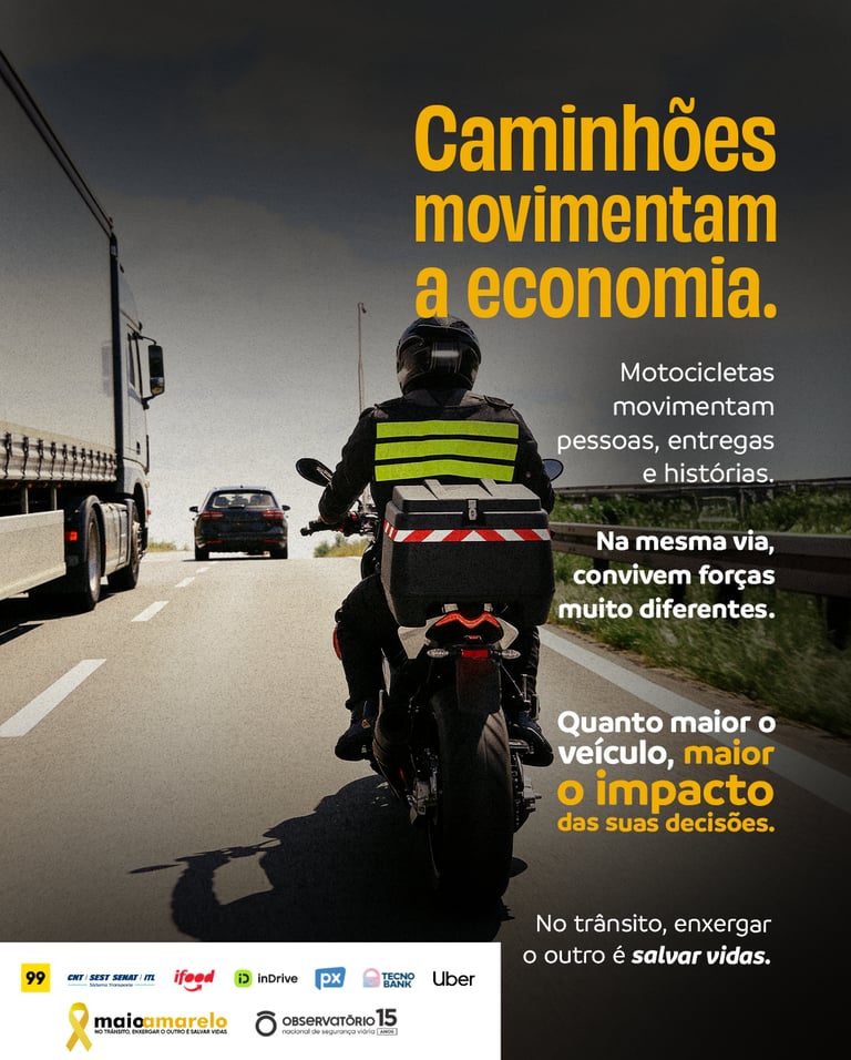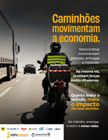 Um dos momentos mais impactantes da nossa abordagem para a campanha Maio Amarelo 2026 é a análise da dinâmica entre veículos pesados e motocicletas. O tráfego nos corredores cria um cenário de altíssimo risco, onde a diferença de tamanho e visibilidade é fatal.